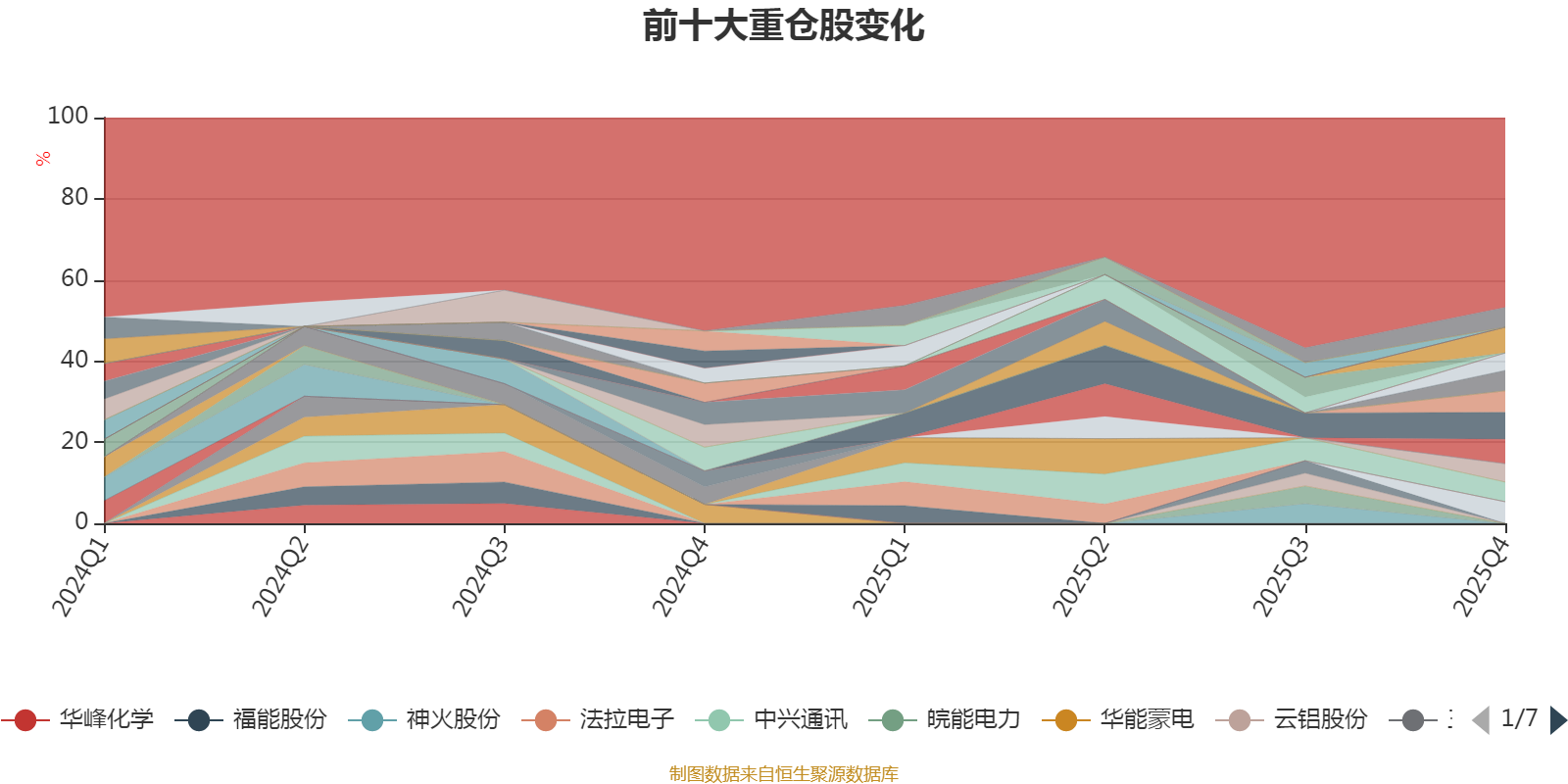 截至2025年末,基金十大重仓股分别是国电电力、美的集团、中国平安、三角防务、铜陵有色、伊利股份、紫金矿业、宁德时代、伯特利、东阿阿胶。