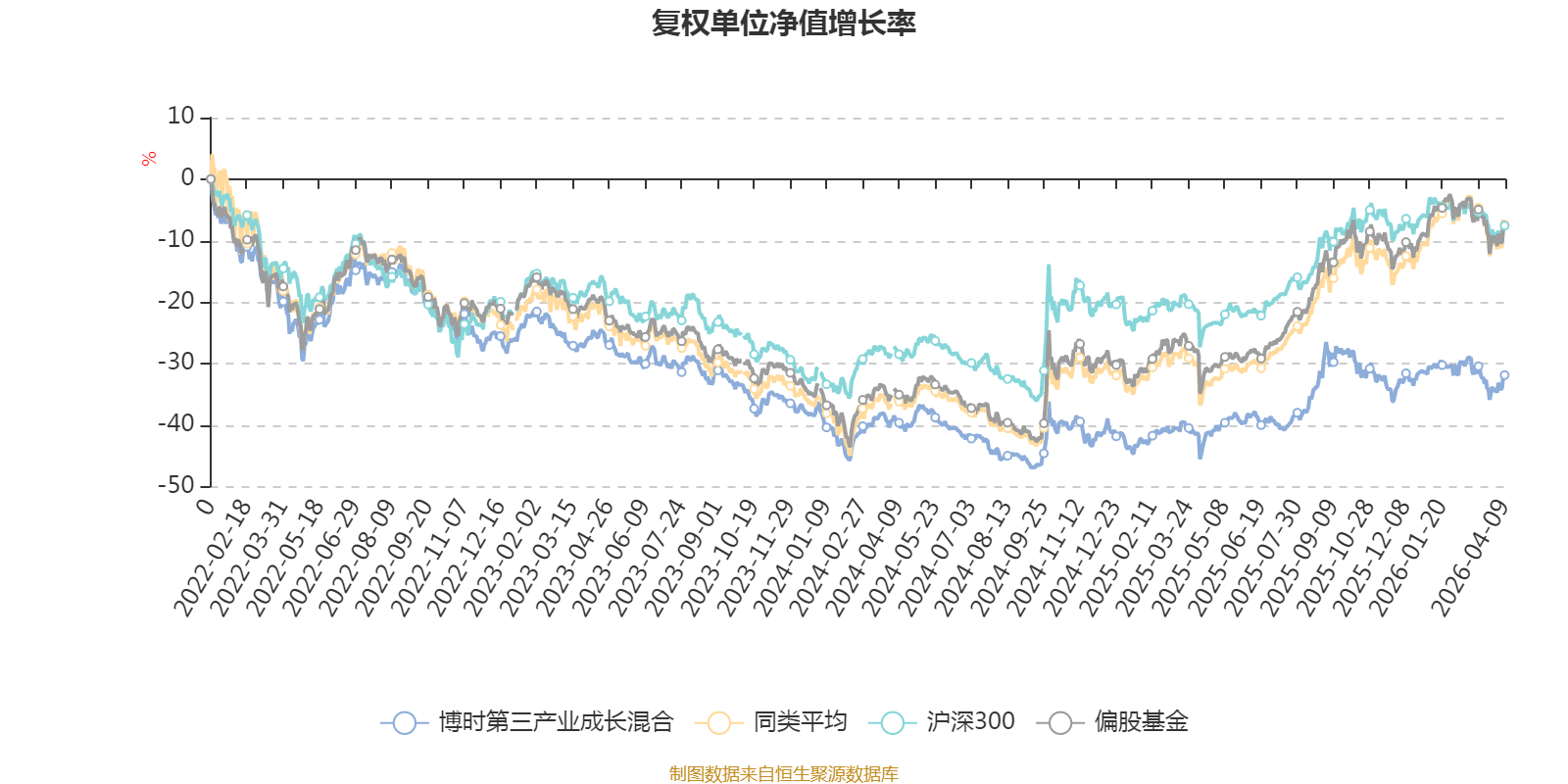 截至4月9日,博时第三产业成长混合近三个月复权单位净值增长率为-2.33%,位于同类可比基金156/265;近半年复权单位净值增长率为-5.32%,位于同类可比基金214/265;近一年复权单位净值增长率为21.09%,位于同类可比基金218/265;近三年复权单位净值增长率为-9.64%,位于同类可比基金233/261。