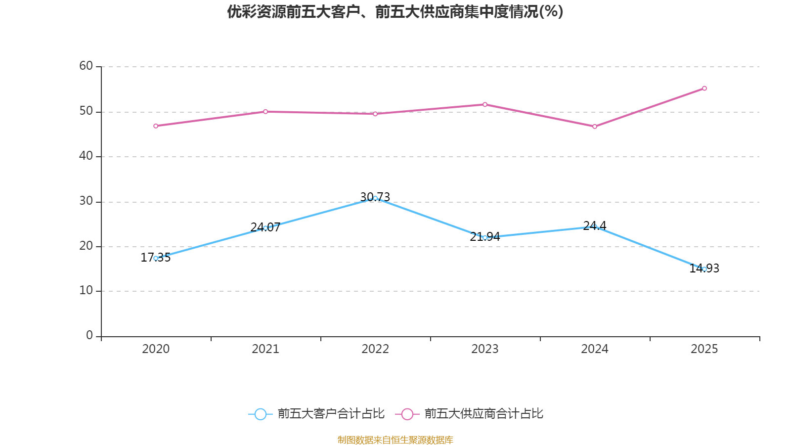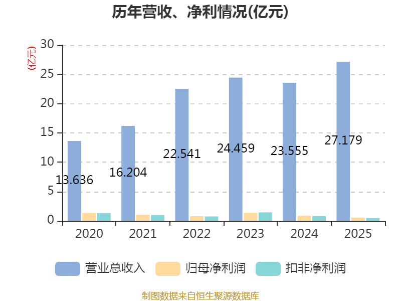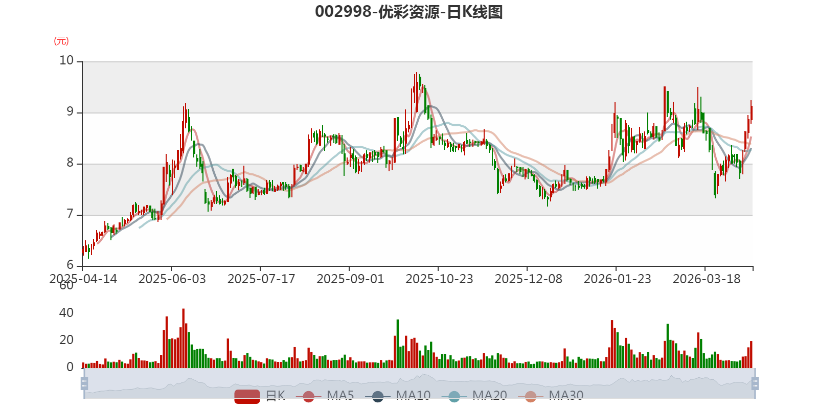 中证智能财讯优彩资源(002998)4月13日披露2025年年度报告。2025年,公司实现营业总收入27.18亿元,同比增长15.39%;归母净利润5205.67万元,同比下降37.86%;扣非净利润4674.05万元,同比下降41.42%;经营活动产生的现金流量净额为2.57亿元,上年同期为-1.15亿元;报告期内,优彩资源基本每股收益为0.16元,加权平均净资产收益率为3.08%。利润分配预案为:拟向全体股东每10股派发现金红利 1.7 元(含税)。