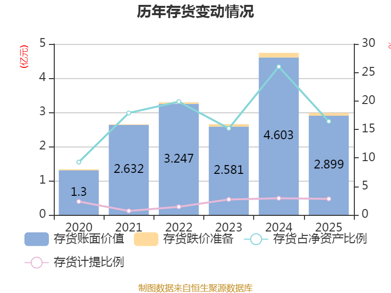 从存货变动来看,截至2025年末,公司存货账面价值为2.9亿元,占净资产的16.41%,较上年末减少1.7亿元。其中,存货跌价准备为838.87万元,计提比例为2.81%。