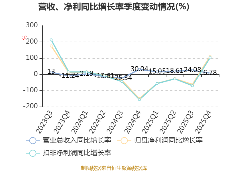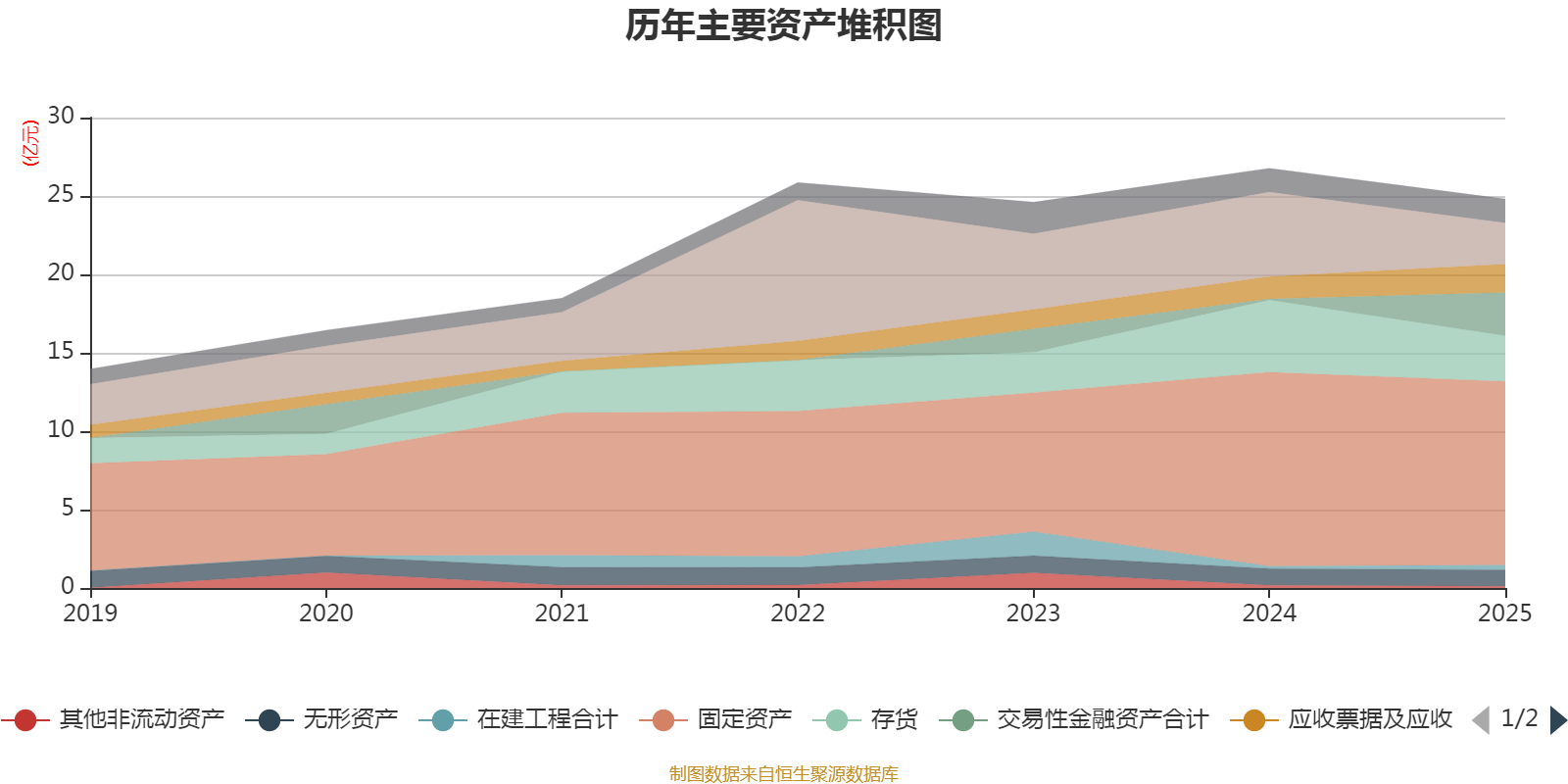 资产重大变化方面,截至2025年末,公司交易性金融资产合计较上年末增加3756.17%,占公司总资产比重上升10.91个百分点;货币资金较上年末减少51.17%,占公司总资产比重下降9.53个百分点;存货较上年末减少37.02%,占公司总资产比重下降5.51个百分点;应收票据及应收账款较上年末增加27.01%,占公司总资产比重上升1.97个百分点。