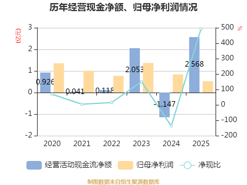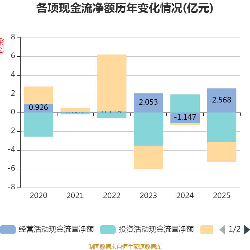截至2025年,公司经营活动现金流净额为2.57亿元,同比增加3.72亿元;筹资活动现金流净额-2.14亿元,同比减少1.94亿元;投资活动现金流净额-3.16亿元,上年同期为1.93亿元。