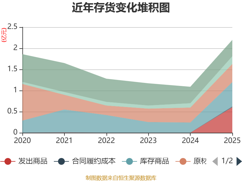 从存货变动来看,截至2025年末,公司存货账面价值为2.2亿元,占净资产的60.1%,较上年末增加1.11亿元。其中,存货跌价准备为1685.51万元,计提比例为7.13%。