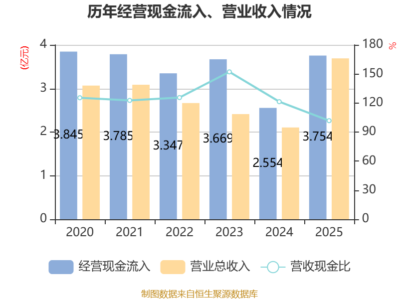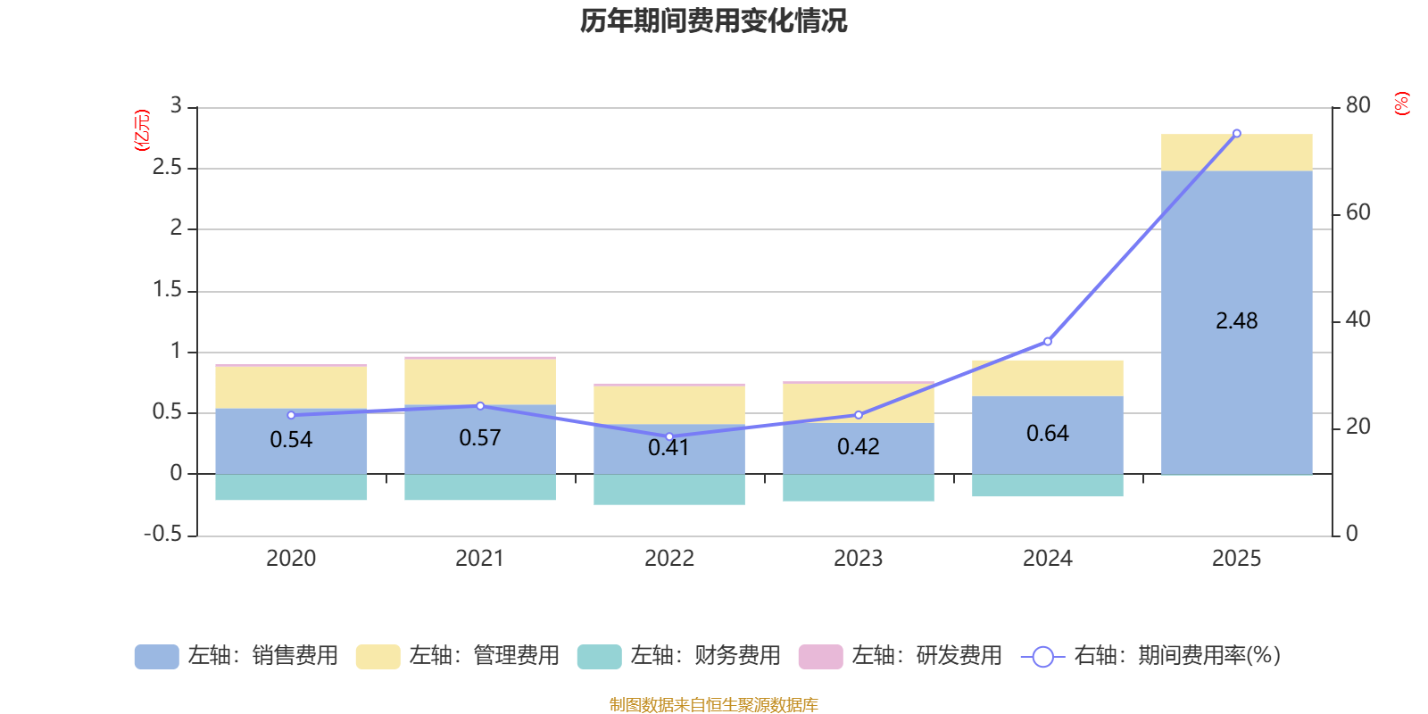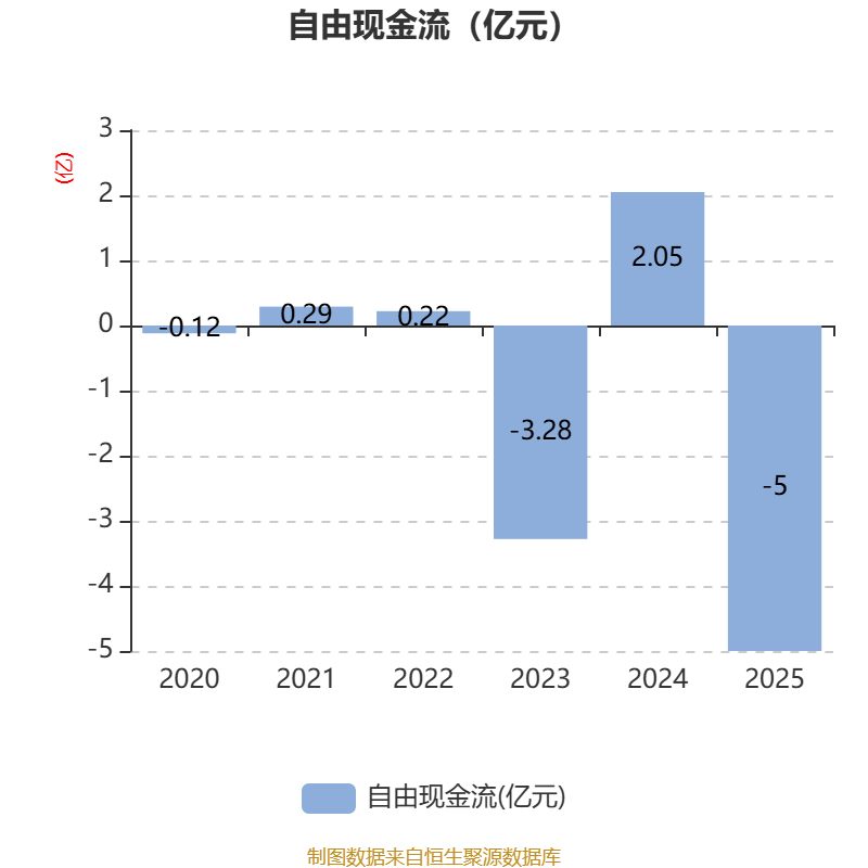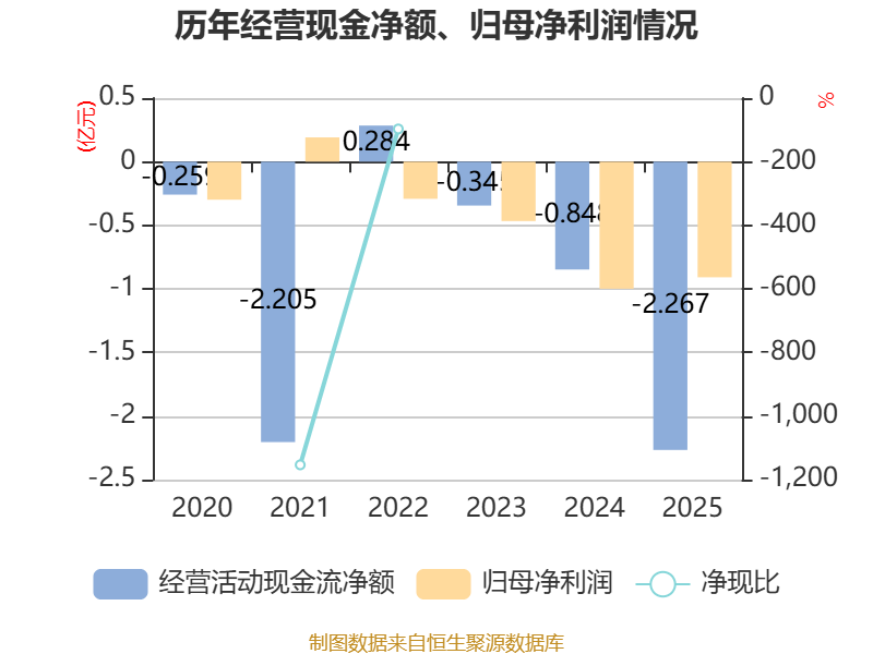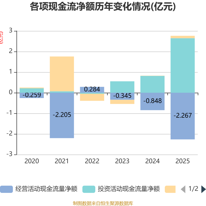 截至2025年,公司经营活动现金流净额为-2.27亿元,同比减少1.42亿元;筹资活动现金流净额1162.6万元,同比增加1056.13万元;投资活动现金流净额2.65亿元,上年同期为8180.26万元。