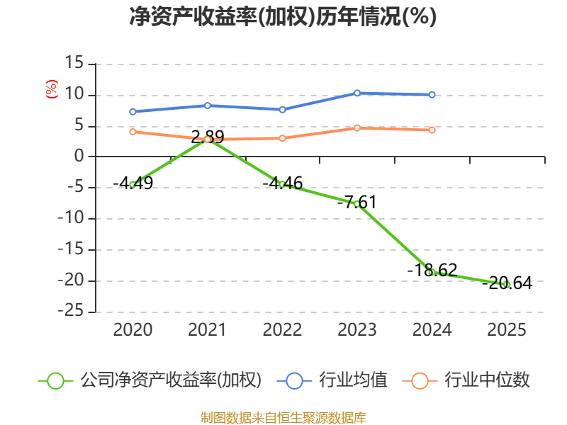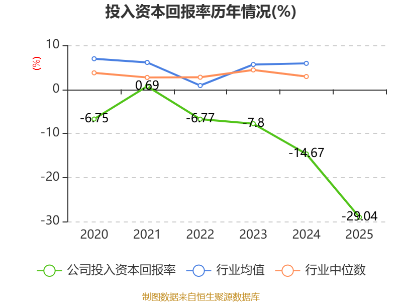 数据显示,2025年公司加权平均净资产收益率为-20.64%,较上年同期下降2.02个百分点。公司2025年投入资本回报率为-29.04%,较上年同期下降14.37个百分点。