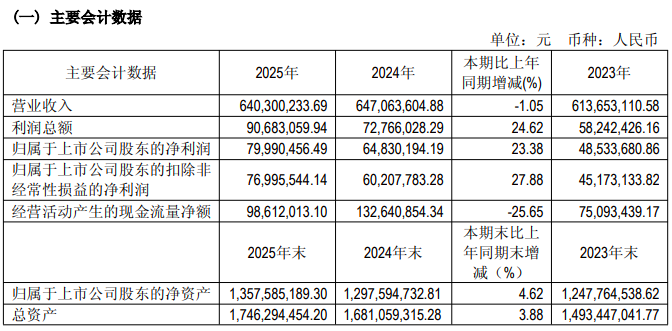二是利润指标逆势大幅上扬。在营收微降的背景下,公司利润总额为9068.31万元,同比增长24.62%;归母净利润7999.05万元,同比增长23.38%;扣非后净利润7699.55万元,增幅更高达27.88%。
