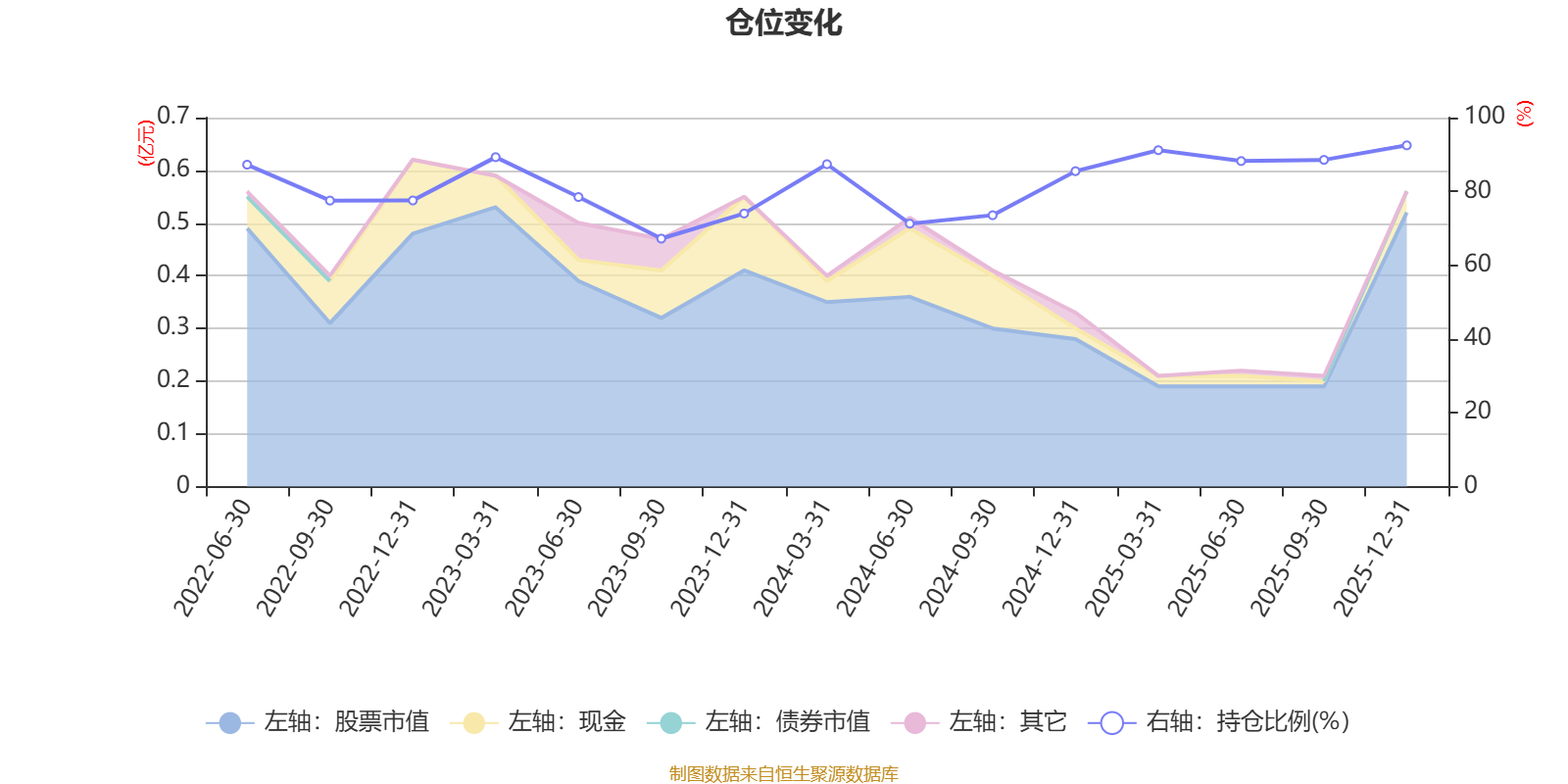 据定期报告数据统计,近三年平均股票仓位为82.25%,同类平均为84.04%。2025年末基金达到92.48%的最高仓位,2023年三季度末最低,为67.2%。