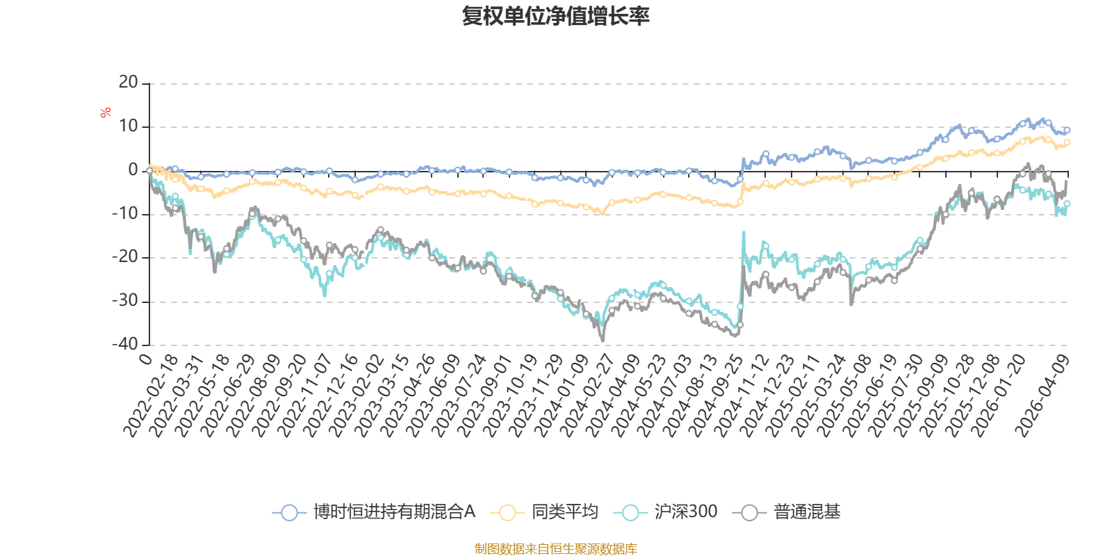 截至4月9日,博时恒进持有期混合A近三个月复权单位净值增长率为-0.39%,位于同类可比基金423/629;近半年复权单位净值增长率为-1.21%,位于同类可比基金539/629;近一年复权单位净值增长率为8.44%,位于同类可比基金246/629;近三年复权单位净值增长率为8.44%,位于同类可比基金371/581。