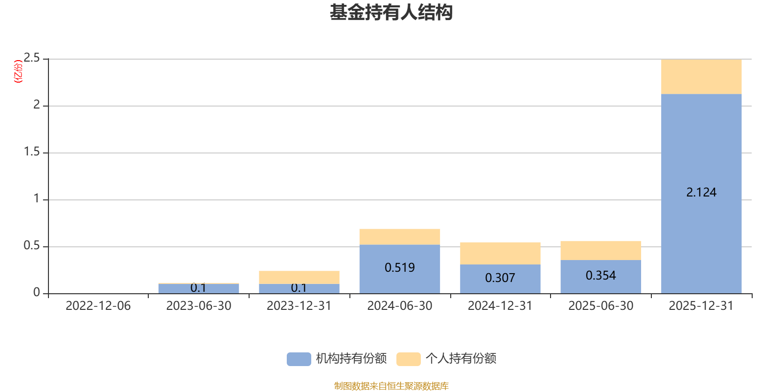 截至2025年12月31日,基金持有人共计2976户,合计持有2.49亿份。其中管理人员工持有918.7万份,占比3.69%,机构持有份额占比85.30%,个人投资者占比14.70%。