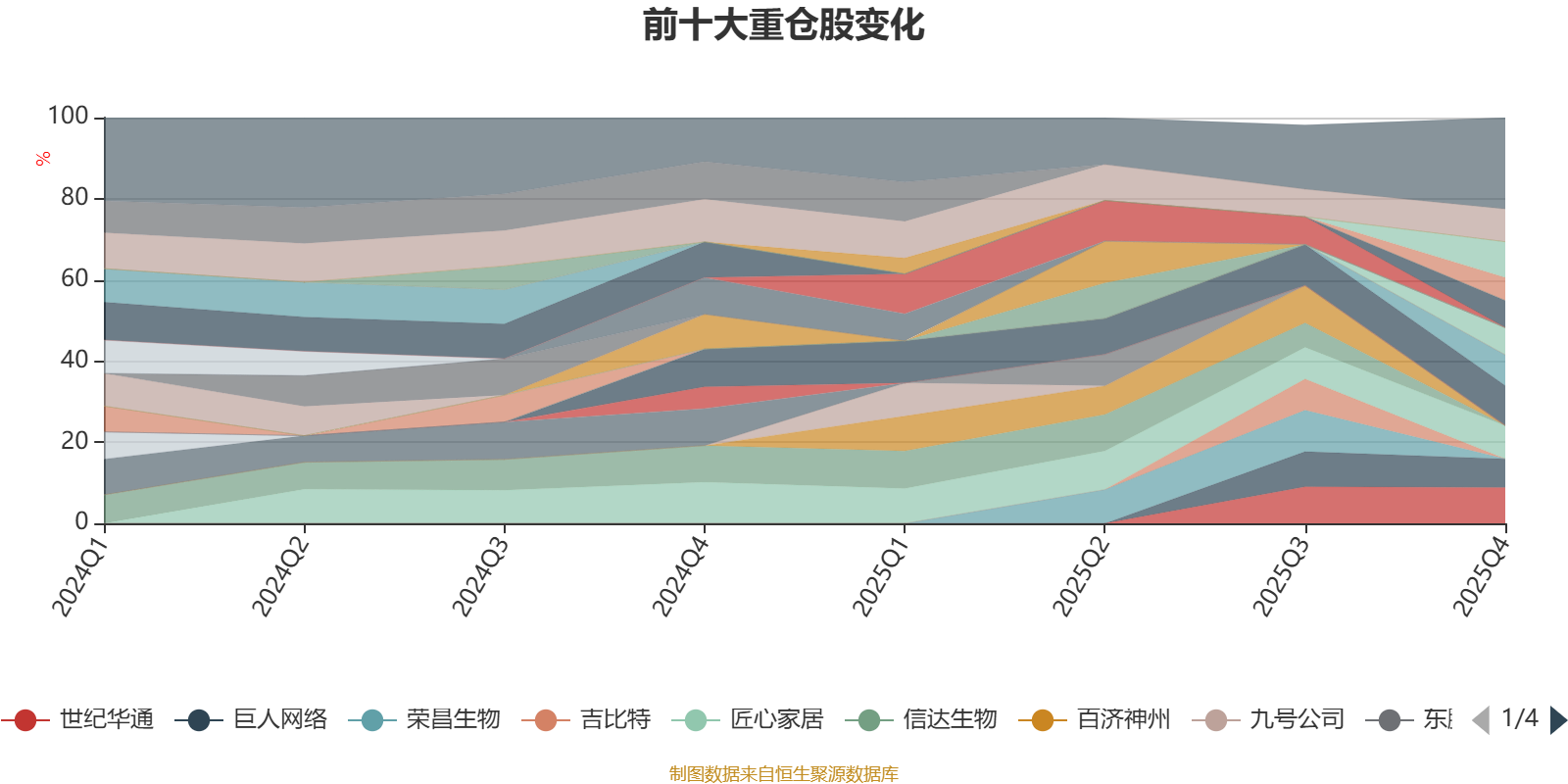 该基金持股集中度较高,近2年前十大重仓股集中度长期超过60%。截至2025年末,基金十大重仓股分别是康方生物、世纪华通、三棵树、匠心家居、嘉益股份、英科医疗、巨人网络、兔宝宝、神农集团、海尔智家。