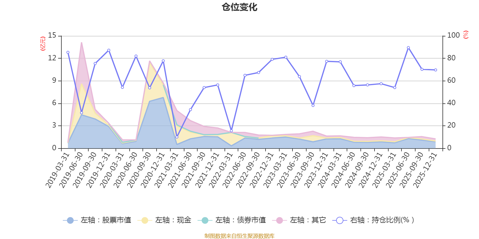 据定期报告数据统计,近三年平均股票仓位为65.86%,同类平均为72.57%。2025年上半年末基金达到89.54%的最高仓位,2021年一季度末最低,为10.05%。