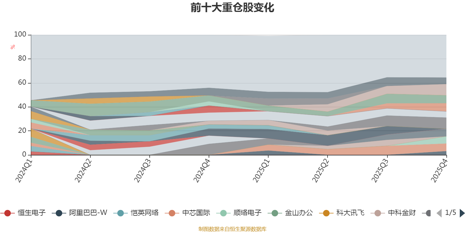 截至2025年末,基金十大重仓股分别是中际旭创、新易盛、金盘科技、立讯精密、中芯国际、源杰科技、顺络电子、海光信息、蓝思科技、阿里巴巴-W。