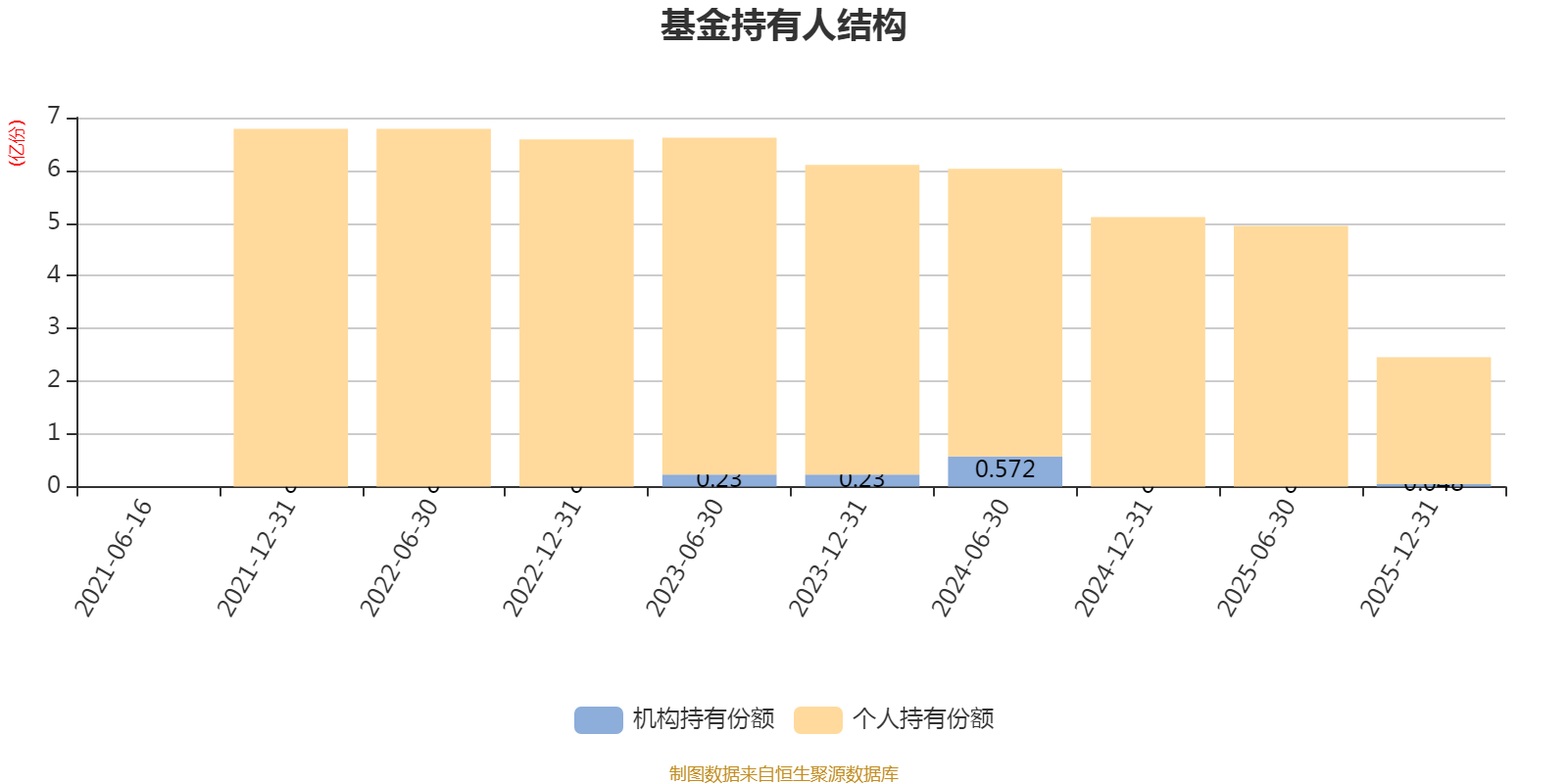 截至2025年12月31日,基金持有人共计5691户,合计持有2.45亿份。其中管理人员工持有6.65万份,占比0.03%,机构持有份额占比1.95%,个人投资者占比98.05%。