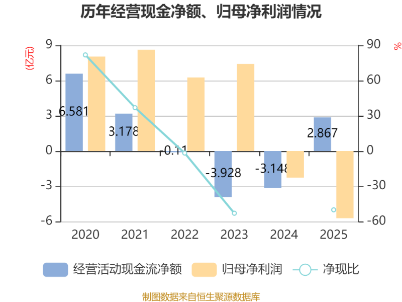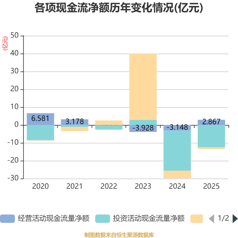 截至2025年,公司经营活动现金流净额为2.87亿元,同比增加6.01亿元;筹资活动现金流净额-1.01亿元,同比增加3.19亿元;投资活动现金流净额-12.51亿元,上年同期为-22.51亿元。