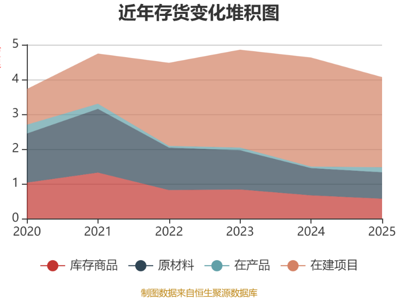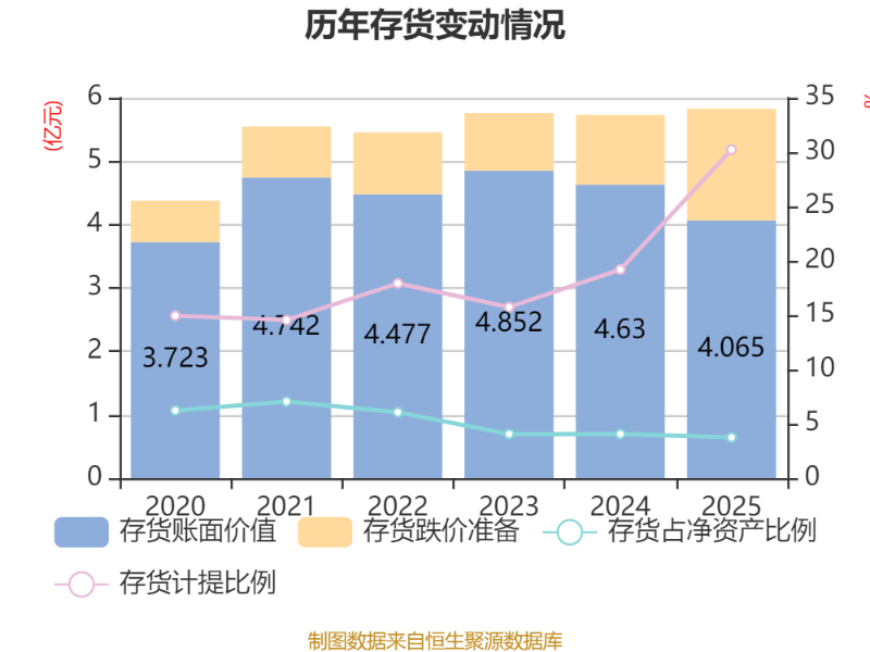 从存货变动来看,截至2025年末,公司存货账面价值为4.07亿元,占净资产的3.75%,较上年末减少5647.99万元。其中,存货跌价准备为1.76亿元,计提比例为30.23%。