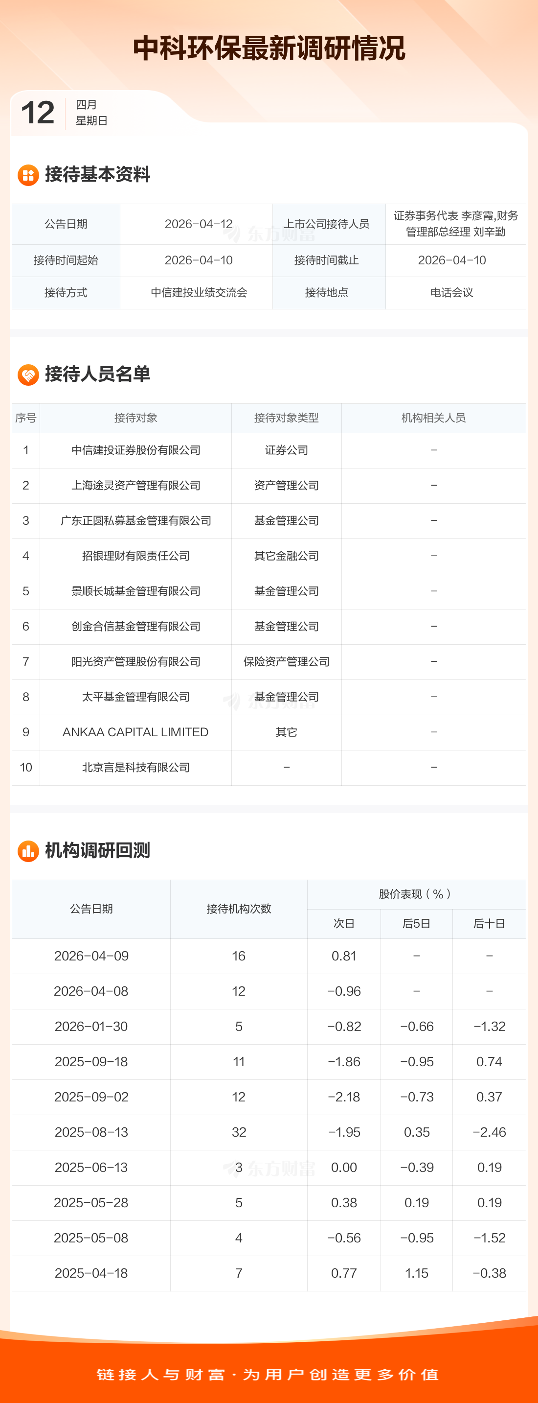 中科环保4月12日公告称,4月10日接待中信建投证券股份有限公司等10家机构调研。接待人员包括证券事务代表 李彦霞,财务管理部总经理 刘辛勤。