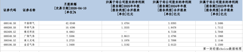 中船特气2025年归母净利润为3.47亿元,较2024年的3.03亿元显著增长;南大光电归母净利润为3.19亿元,2024年同期为2.71亿元;广钢气体归母净利润为2.86亿元,较2024年的2.48亿元亦有明显提升。然而,后两者近一个月的股价涨幅明显弱于华特气体。Choice数据显示,南大光电、广钢气体近一个月涨幅分别仅为7.55%和5.27%。