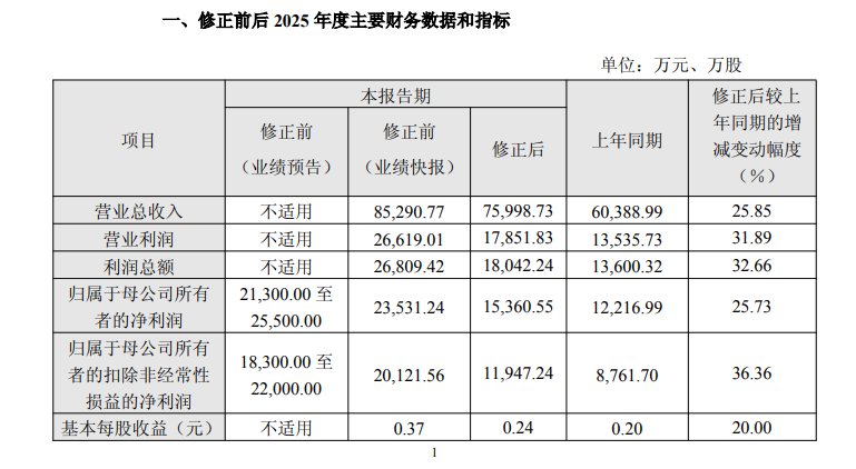 值得一提的是,当时公告披露,公司不存在影响本次业绩快报内容准确性的重大不确定因素。公告所载2025年年度主要财务数据为初步核算数据,未经会计师事务所审计,主要财务指标可能与公司2025年年度报告中披露的数据存在差异。