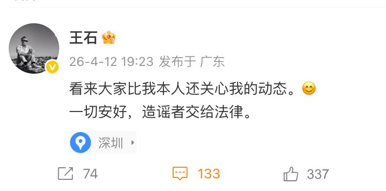 4月12日,王石实名微博更新回应市场传闻称:“看来大家比我本人还关心我的动态。一切安好,造谣者交给法律。”