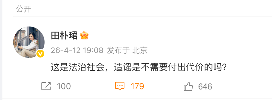 同日,田朴珺实名微博发文称:“这是法治社会,造谣是不需要付出代价的吗?”