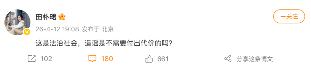稍早前,田朴珺则称:“这是法治社会,造谣是不需要付出代价的吗?”