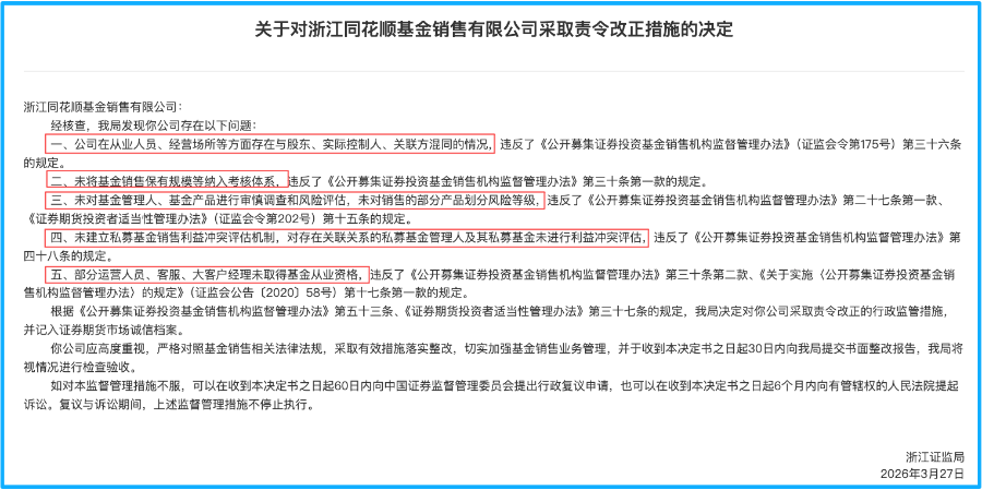 4月10日,浙江证监局官网发布了一则针对浙江同花顺基金销售有限公司(以下简称“同花顺基金销售”)的行政监管措施决定书。这家拥有庞大流量加持的国内头部第三方基金销售平台,因五项违规问题被责令改正,并被记入证券期货市场诚信档案。