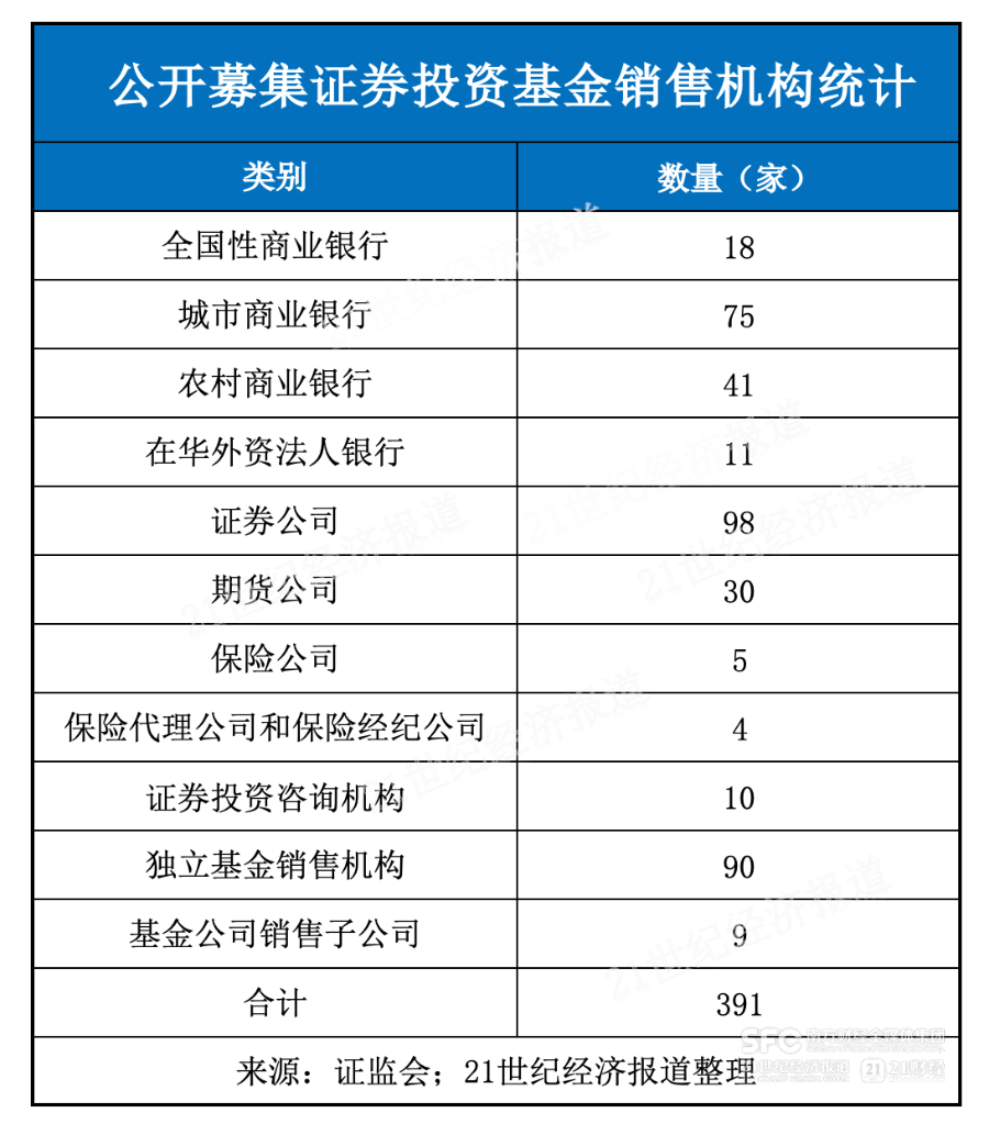 自2025年以来,监管机构对基金销售领域的检查力度持续加强,处罚范围覆盖银行、券商、第三方平台等各类代销渠道。21世纪经济报道记者根据证监会2026年3月发布的《公开募集证券投资基金销售机构名录》统计,目前共有391家公募基金销售机构,其中包括同花顺基金销售在内的90家独立基金销售机构,以及10家证券投资咨询机构、9家基金公司销售子公司等。