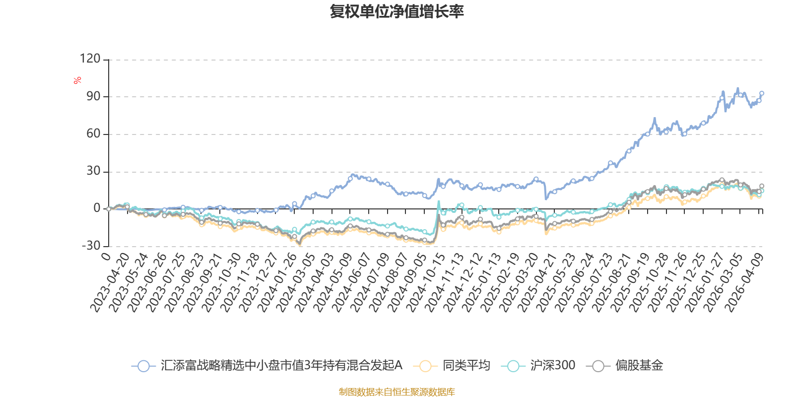 截至4月9日,汇添富战略精选中小盘市值3年持有混合发起A近三个月复权单位净值增长率为10.91%,位于同类可比基金51/689;近半年复权单位净值增长率为11.08%,位于同类可比基金127/689;近一年复权单位净值增长率为76.81%,位于同类可比基金76/685;近三年复权单位净值增长率为93.36%,位于同类可比基金14/417。