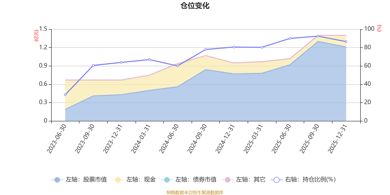 据定期报告数据统计,成立以来平均股票仓位为71.63%,同类平均为84.04%。2025年三季度末基金达到92.47%的最高仓位,2023年上半年末最低,为28.58%。
