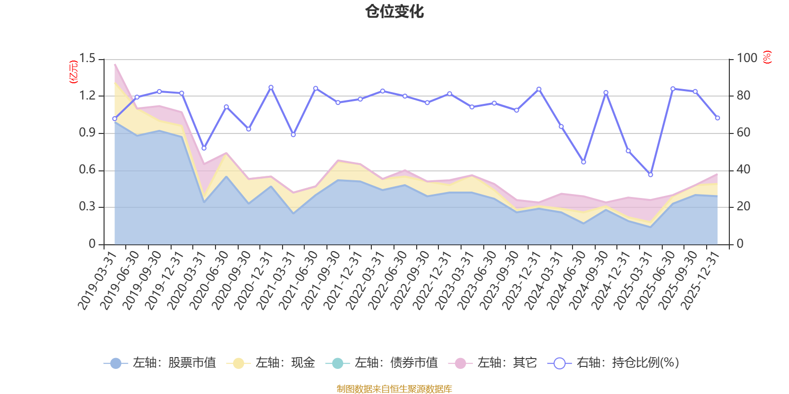据定期报告数据统计,近三年平均股票仓位为68.32%,同类平均为72.57%。2020年末基金达到84.79%的最高仓位,2025年一季度末最低,为37.66%。