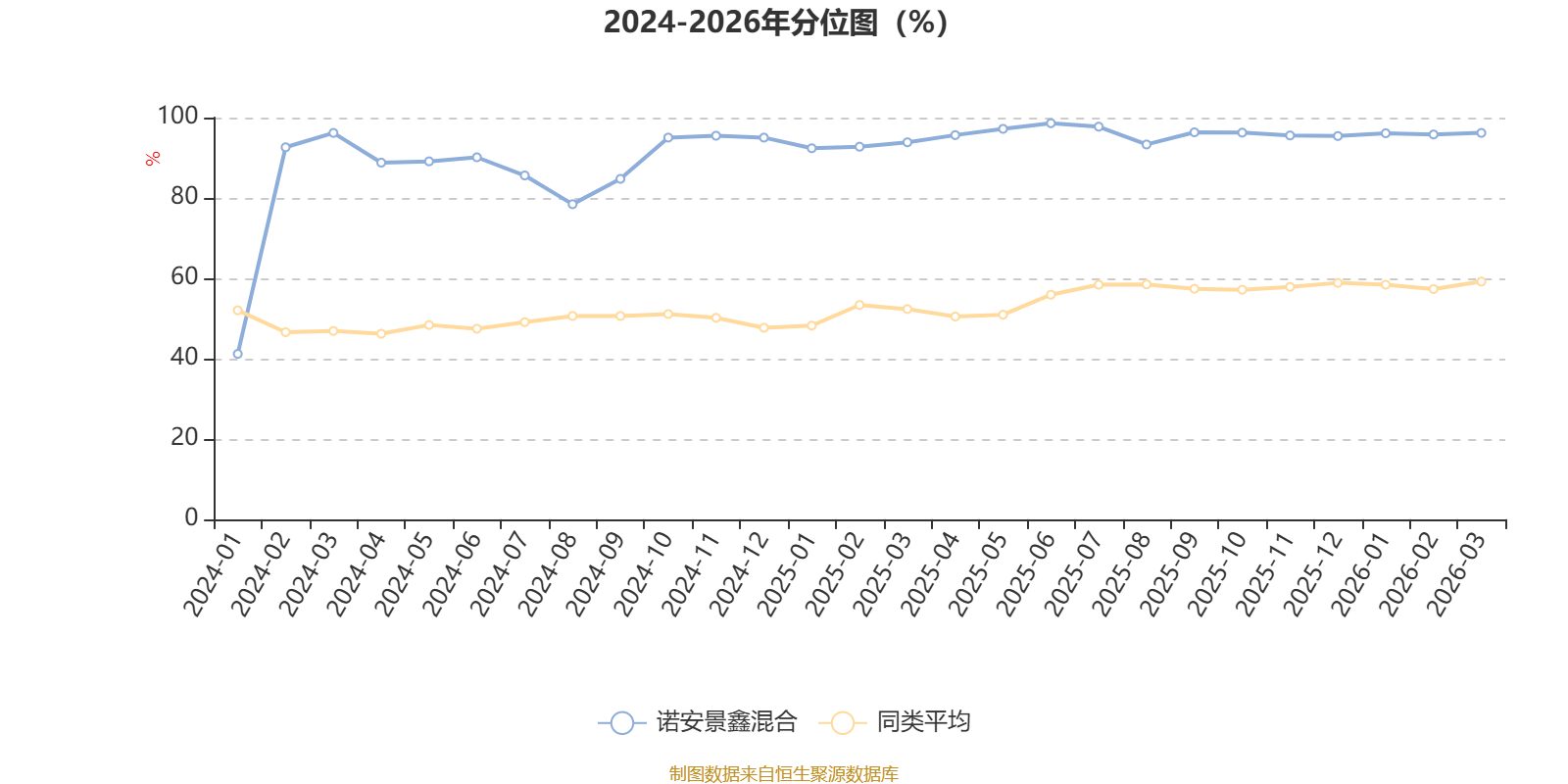 通过所选区间该基金净值增长率分位图,可以观察该基金与同类基金业绩比较情况。图为坐标原点到区间内某时点的净值增长率在同类基金中的分位数。