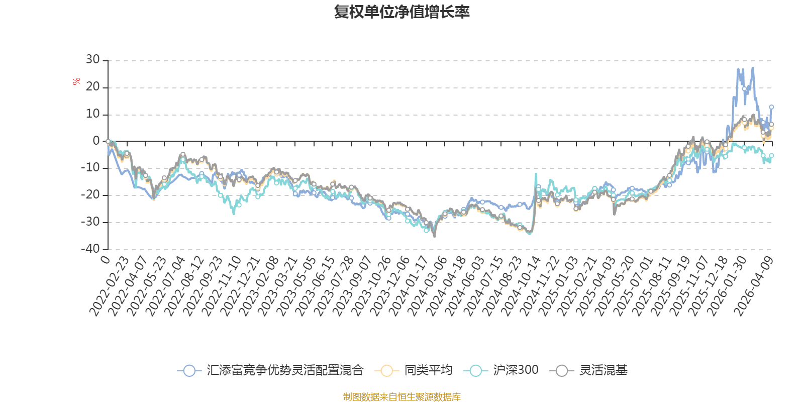 截至4月9日,汇添富竞争优势灵活配置混合近三个月复权单位净值增长率为-2.63%,位于同类可比基金827/1287;近半年复权单位净值增长率为19.62%,位于同类可比基金78/1286;近一年复权单位净值增长率为43.37%,位于同类可比基金448/1286;近三年复权单位净值增长率为37.69%,位于同类可比基金244/1286。