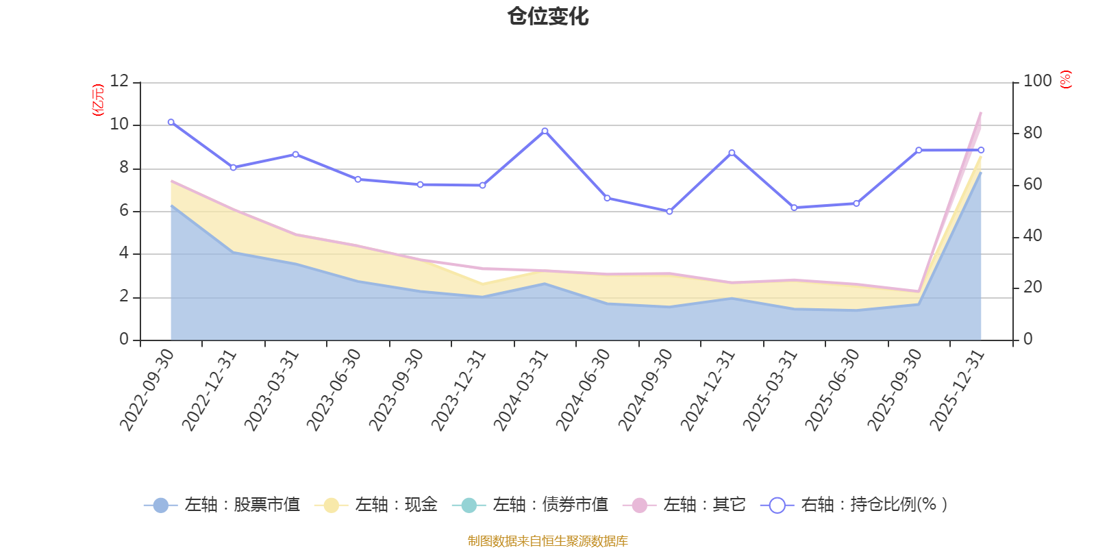 据定期报告数据统计,近三年平均股票仓位为63.76%,同类平均为72.57%。2022年三季度末基金达到84.56%的最高仓位,2024年三季度末最低,为49.89%。