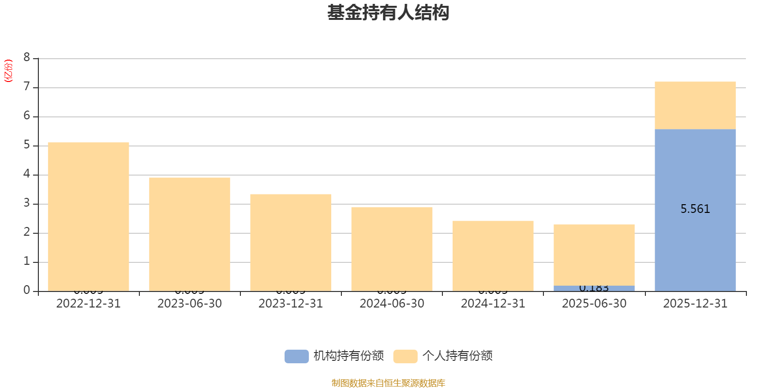 截至2025年12月31日,基金持有人共计6551户,合计持有7.2亿份。其中管理人员工持有162.29万份,占比0.23%,机构持有份额占比77.27%,个人投资者占比22.73%。
