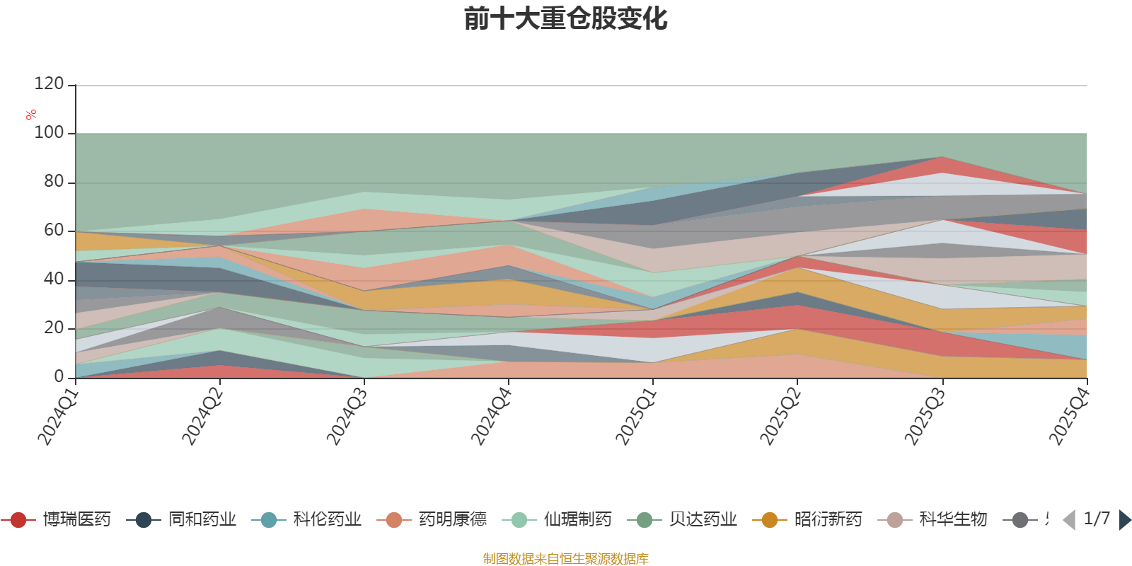 该基金持股集中度较高。截至2025年末,基金十大重仓股分别是康龙化成、普洛药业、可孚医疗、特宝生物、昭衍新药、百济神州、热景生物、阳光诺和、马应龙、泰格医药。