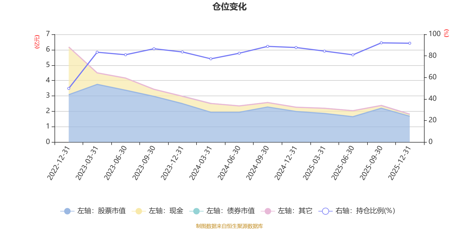 据定期报告数据统计,近三年平均股票仓位为85.05%,同类平均为85.83%。2025年三季度末基金达到92.12%的最高仓位,2022年末最低,为49.83%。