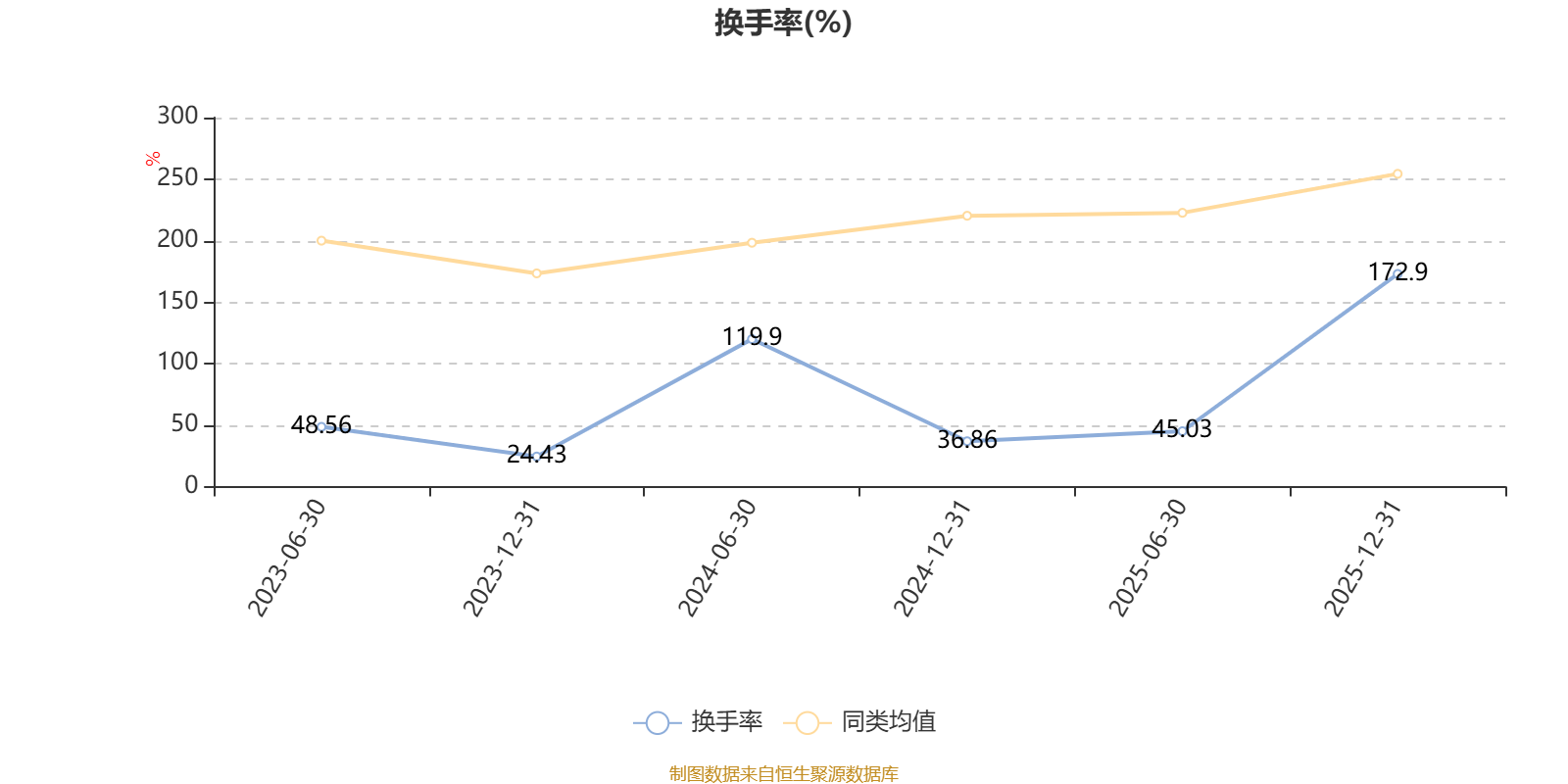 截至2025年12月31日,基金最近一年换手率约213.97%,持续低于同类均值。