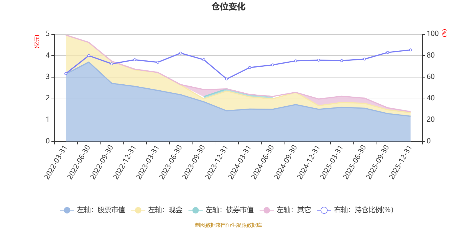 据定期报告数据统计,近三年平均股票仓位为75.21%,同类平均为72.57%。2025年末基金达到85.36%的最高仓位,2023年末最低,为58.25%。