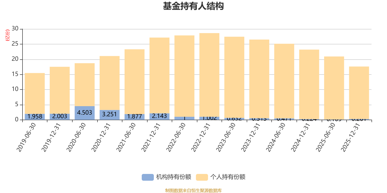 截至2025年12月31日,基金持有人共计65.82万户,合计持有17.59亿份。其中管理人员工持有42.76万份,占比0.02%,机构持有份额占比1.49%,个人投资者占比98.51%。