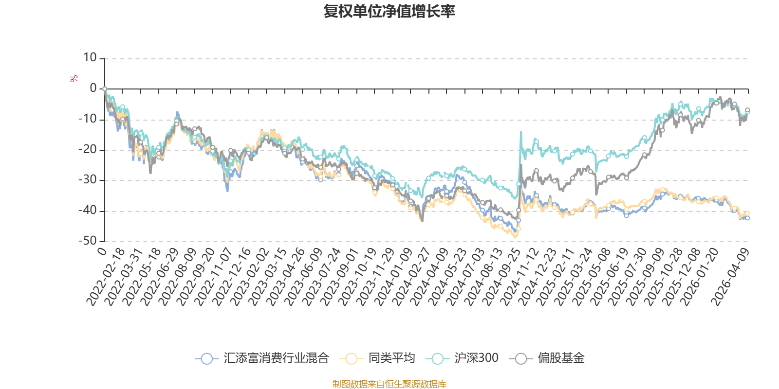 截至4月9日,汇添富消费行业混合近三个月复权单位净值增长率为-9.72%,位于同类可比基金59/85;近半年复权单位净值增长率为-12.28%,位于同类可比基金47/85;近一年复权单位净值增长率为-2.62%,位于同类可比基金44/85;近三年复权单位净值增长率为-28.52%,位于同类可比基金53/76。