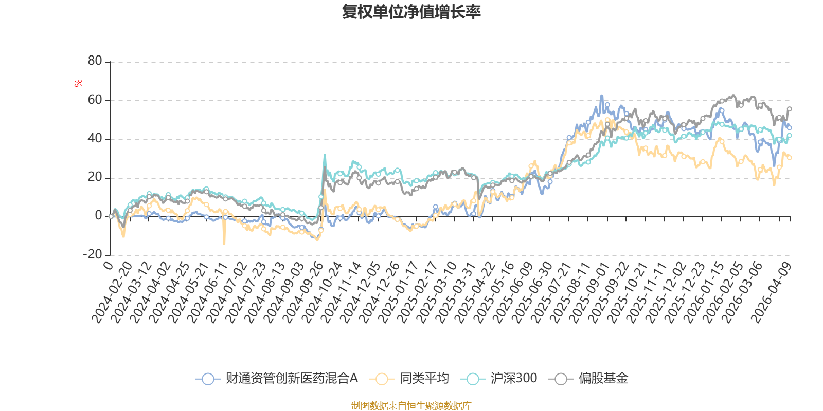 截至4月9日,财通资管创新医药混合A近三个月复权单位净值增长率为-5.22%,位于同类可比基金39/106;近半年复权单位净值增长率为-0.34%,位于同类可比基金9/106;近一年复权单位净值增长率为44.76%,位于同类可比基金13/104。