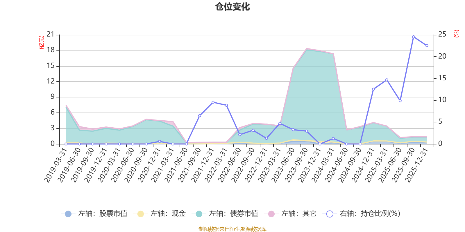 据定期报告数据统计,近三年平均股票仓位为8.03%,同类平均为19.2%。2025年三季度末基金达到24.55%的最高仓位,2020年末最低,为0.59%。