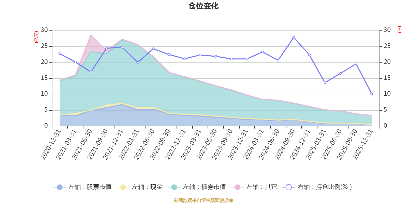 据定期报告数据统计,近三年平均股票仓位为20.01%,同类平均为19.2%。2024年三季度末基金达到27.81%的最高仓位,2025年末最低,为10.13%。