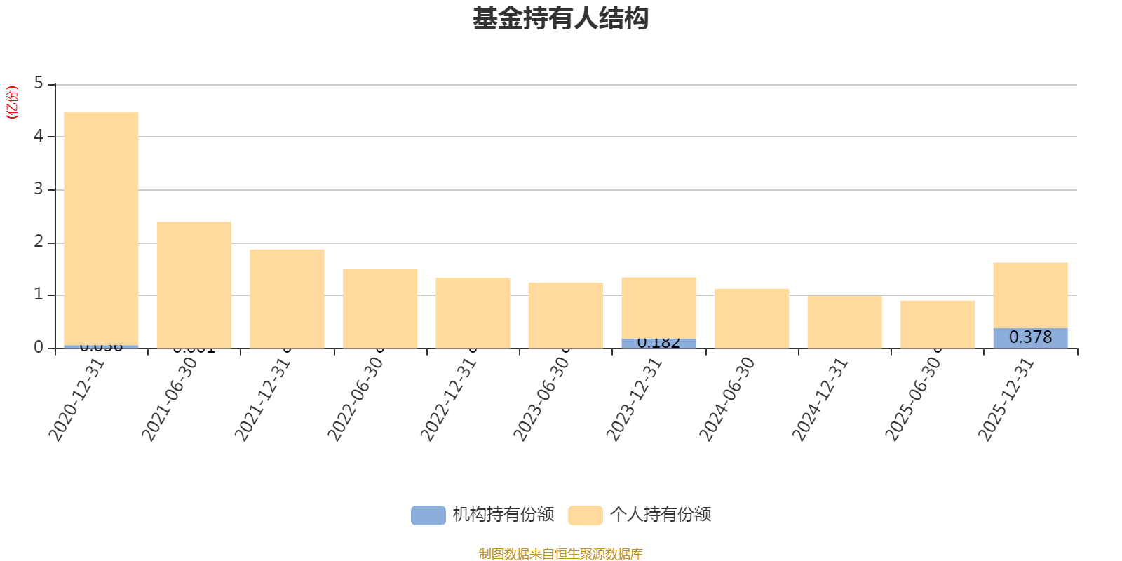 截至2025年12月31日,基金持有人共计1.01万户,合计持有1.62亿份。其中管理人员工持有3.7万份,占比0.02%,机构持有份额占比23.37%,个人投资者占比76.63%。