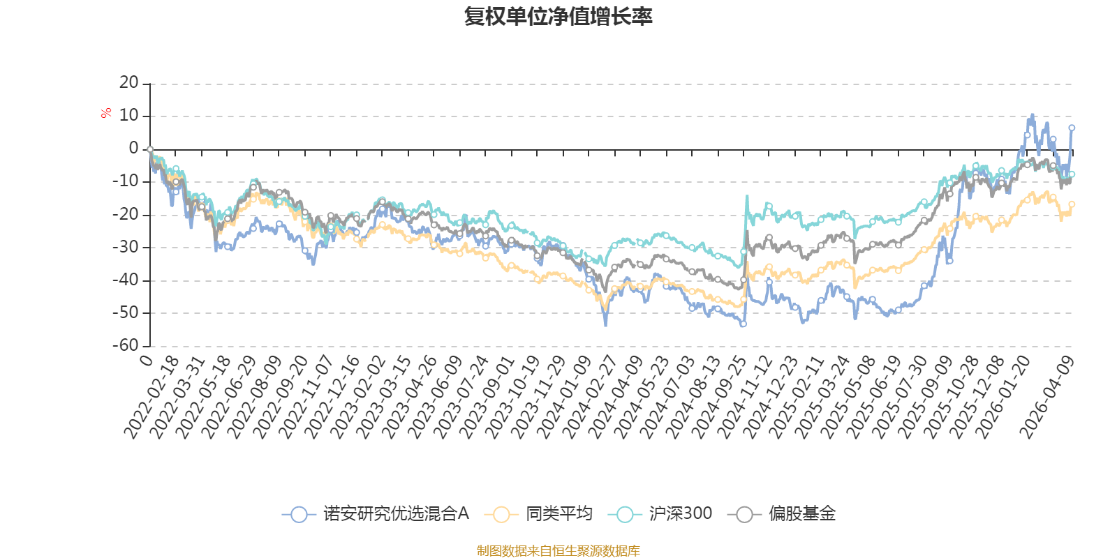 截至4月9日,诺安研究优选混合A近三个月复权单位净值增长率为6.73%,位于同类可比基金88/689;近半年复权单位净值增长率为13.41%,位于同类可比基金104/689;近一年复权单位净值增长率为110.32%,位于同类可比基金27/685;近三年复权单位净值增长率为39.69%,位于同类可比基金76/417。