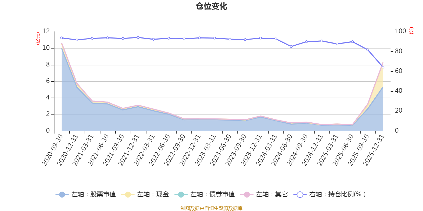 据定期报告数据统计,近三年平均股票仓位为87.78%,同类平均为84.04%。2021年末基金达到94.14%的最高仓位,2025年末最低,为64.25%。