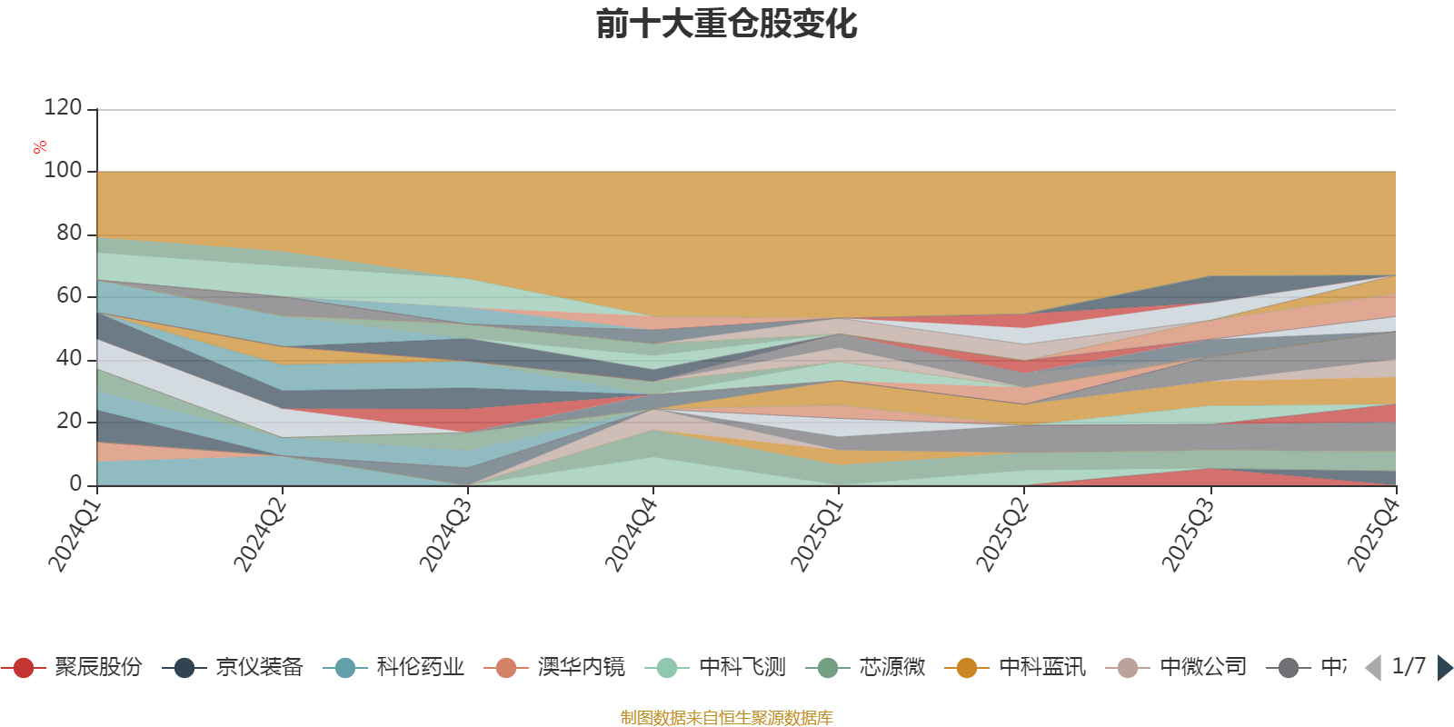 该基金持股集中度较高。截至2025年末,基金十大重仓股分别是中芯国际、寒武纪、芯原股份、杰华特、芯源微、华润微、华丰科技、德明利、北京君正、京仪装备。