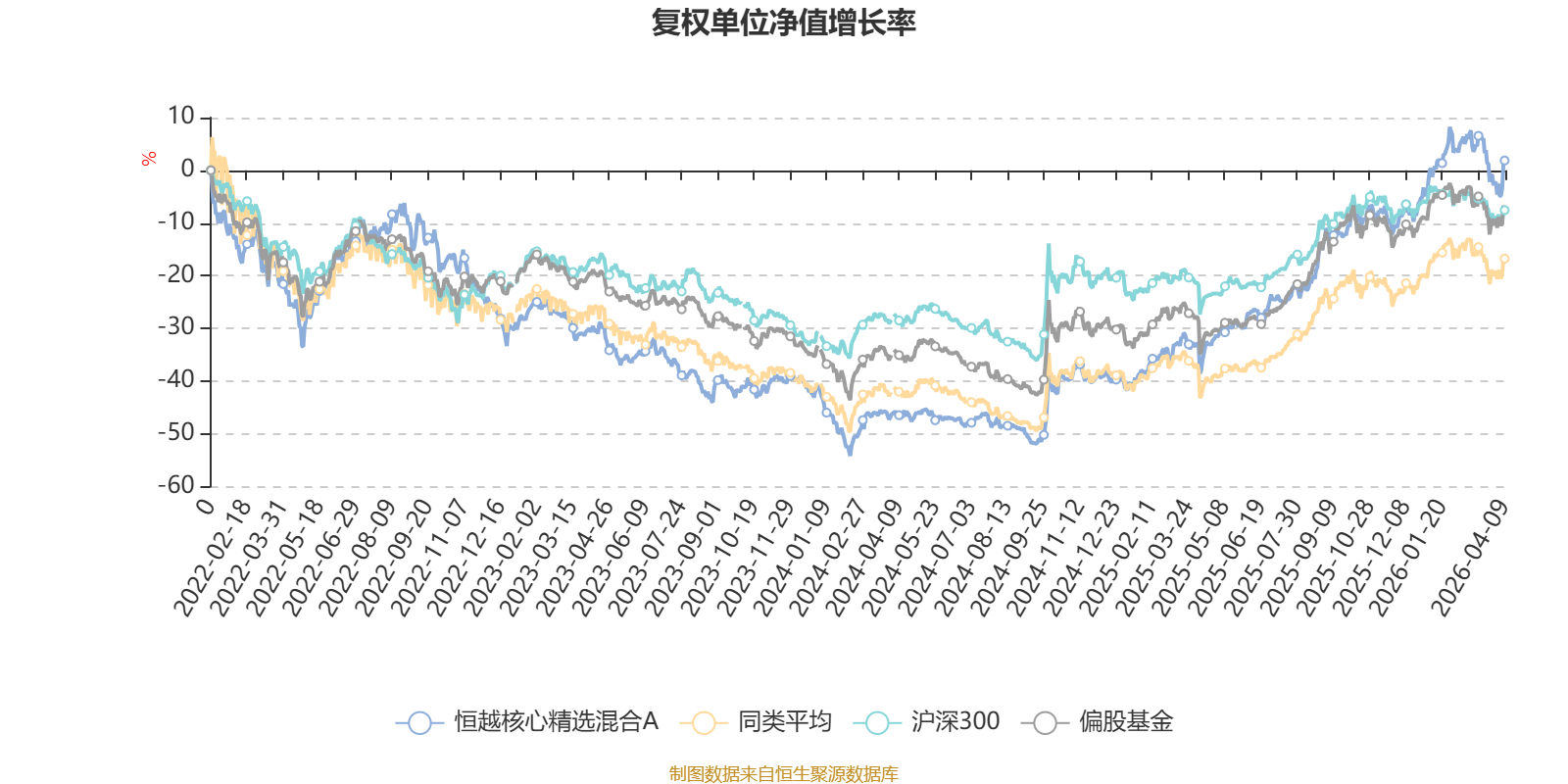 截至4月9日,恒越核心精选混合A近三个月复权单位净值增长率为1.91%,位于同类可比基金192/621;近半年复权单位净值增长率为7.80%,位于同类可比基金132/621;近一年复权单位净值增长率为59.53%,位于同类可比基金132/618;近三年复权单位净值增长率为44.65%,位于同类可比基金88/559。