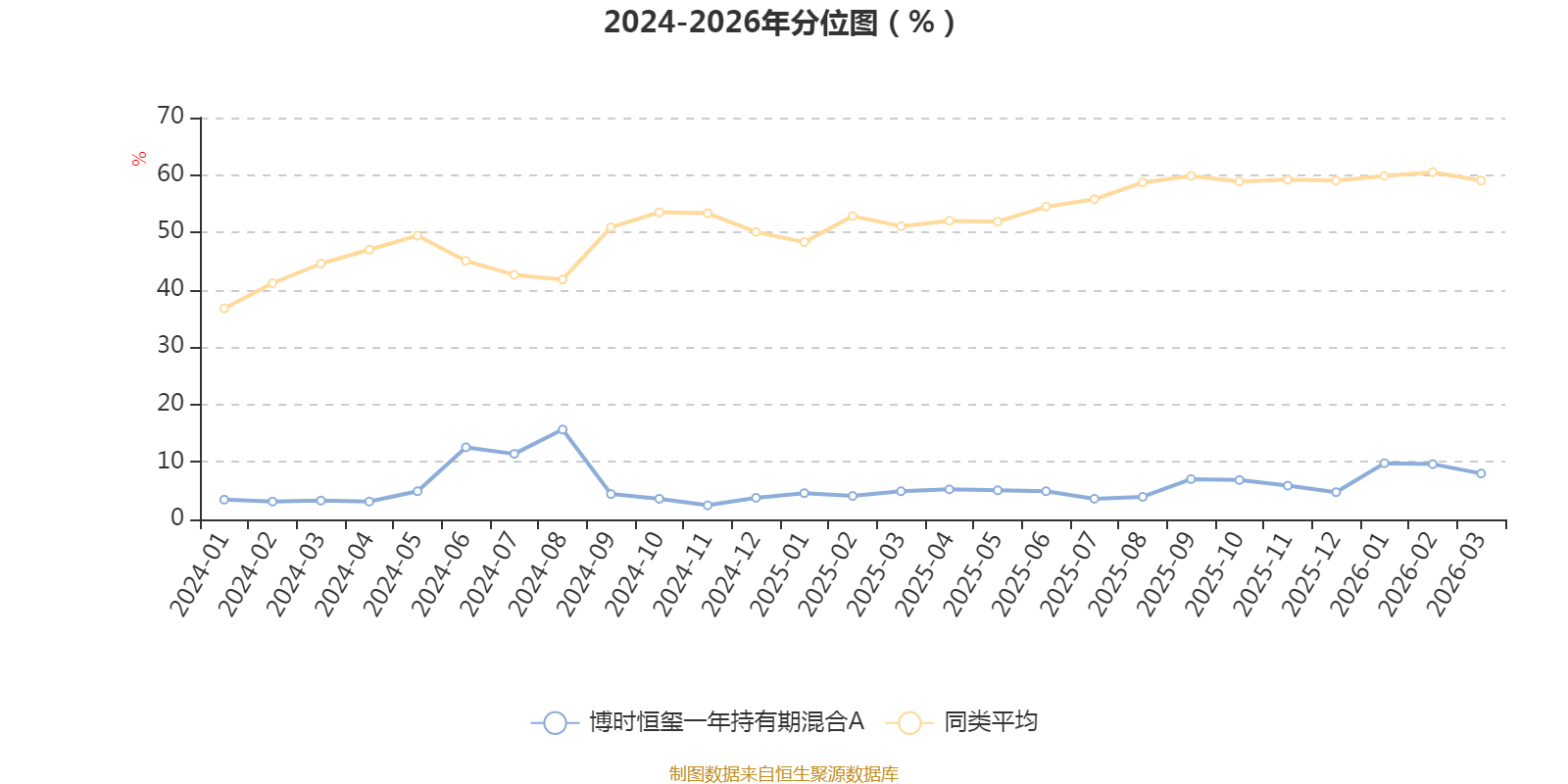 通过所选区间该基金净值增长率分位图,可以观察该基金与同类基金业绩比较情况。图为坐标原点到区间内某时点的净值增长率在同类基金中的分位数。