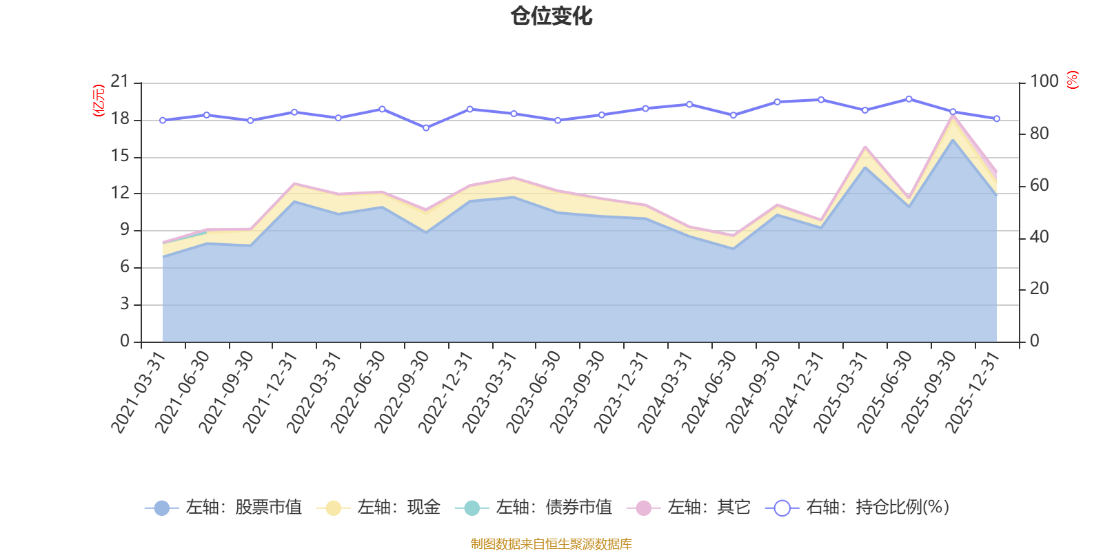 据定期报告数据统计,近三年平均股票仓位为89.51%,同类平均为86.7%。2025年上半年末基金达到93.7%的最高仓位,2022年三季度末最低,为82.58%。